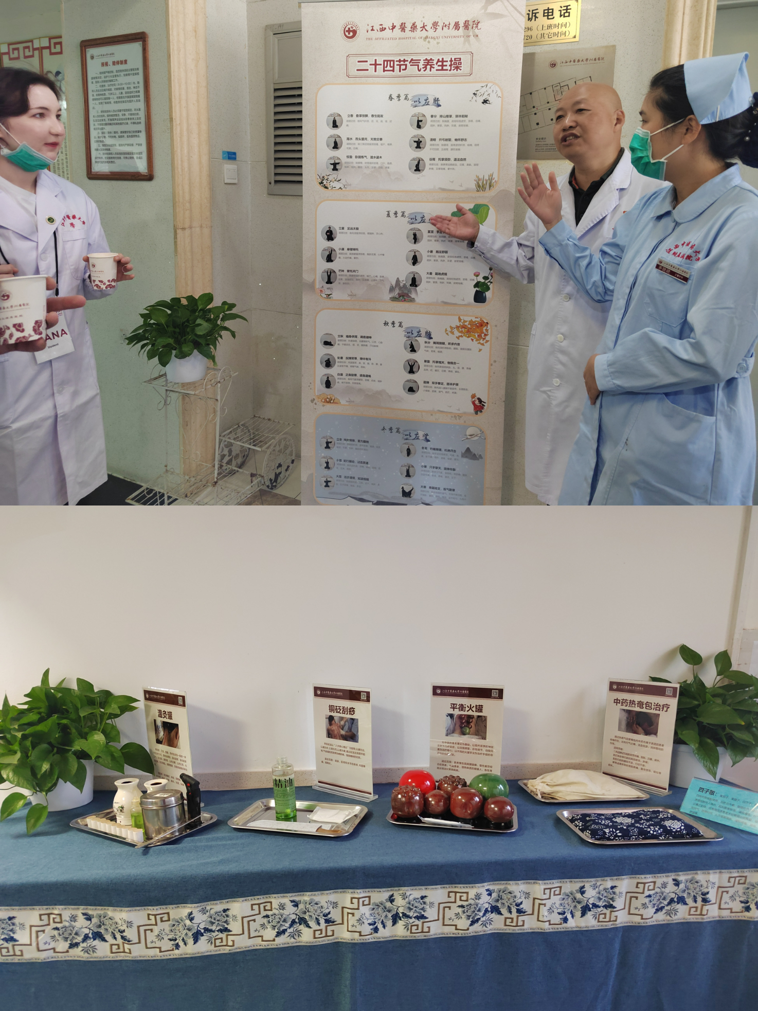 陈岗主任带领俄罗斯代表团品尝我科传统中医特色二十四节气养生茶,感受传统中医特色疗法蜡疗、中药热奄包、中药熏蒸、五音疗法等,并展示运动医学养生康复锻炼及中国传统健身功法《八段锦》、《易筋经》、《二十四节气导引术》。