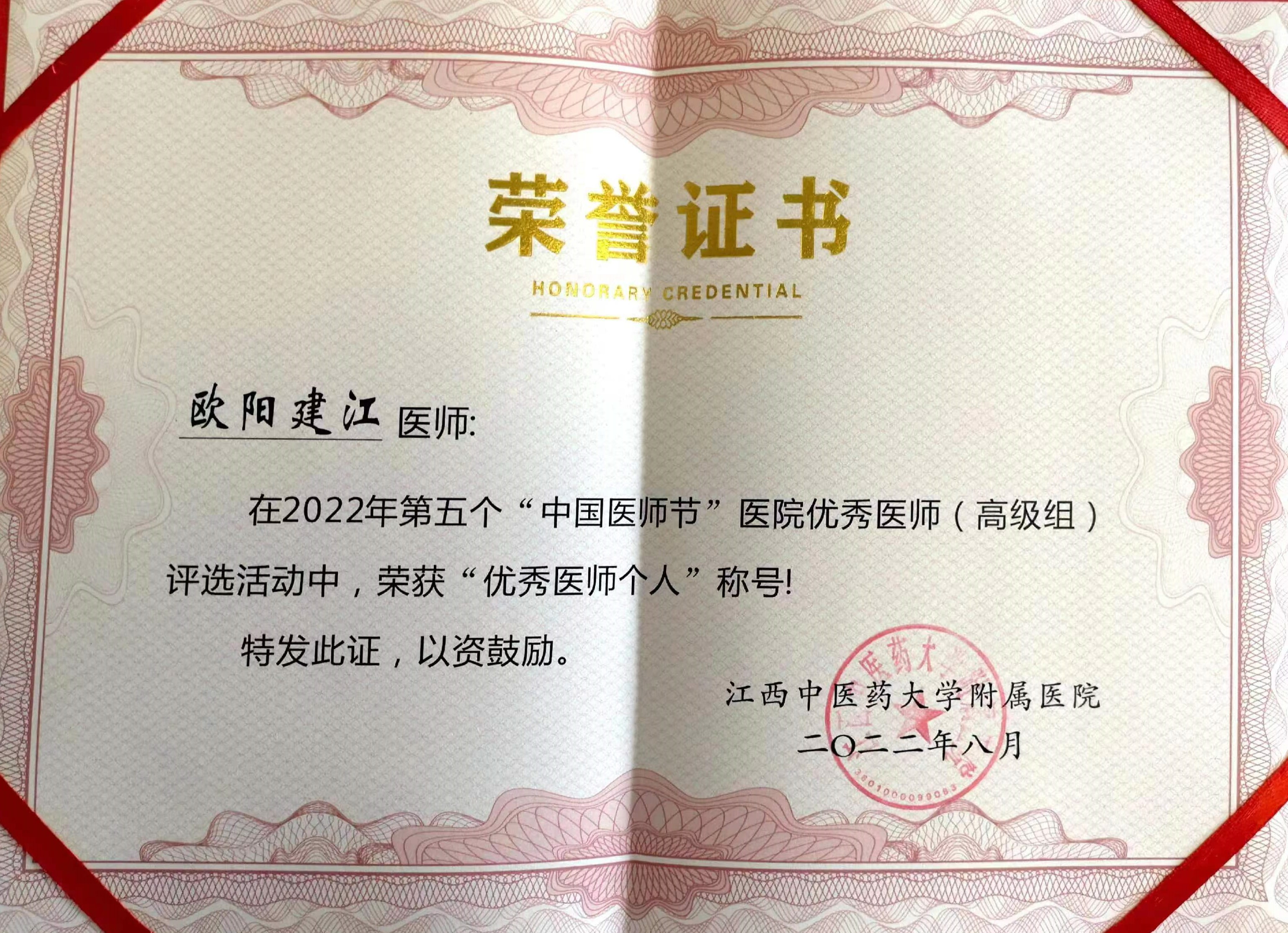 恭喜我科欧阳建江荣获“优秀医师个人”称号 发布时间:2022-09-26点击次数:16919次 2022年8月16日,金瓶梅电影 举行庆祝第五个中国医师节暨表彰大会,其中在“中国医师节”医院优秀医师(高级组)评选活动中,我科副主任中医师欧阳建江荣获“优秀医师个人”称号!