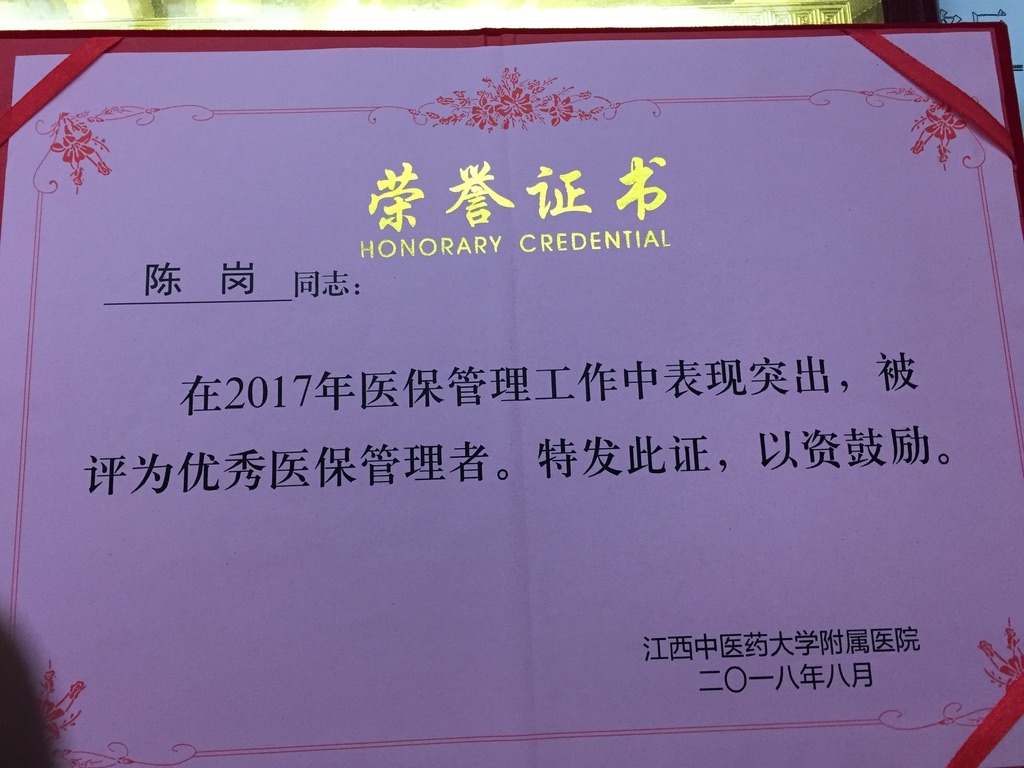陈岗主任被评为2017年优秀医保管理者