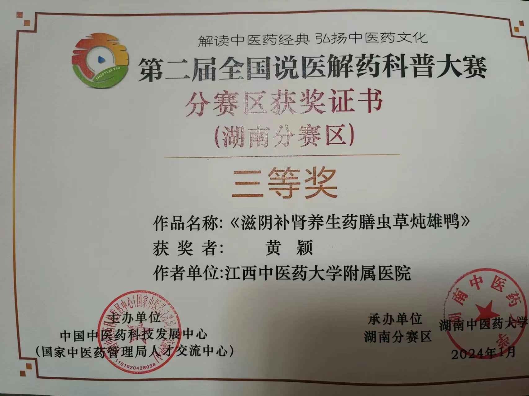黄颖同志荣获2023年第二届全国说医解药科普大赛湖南赛区三等奖