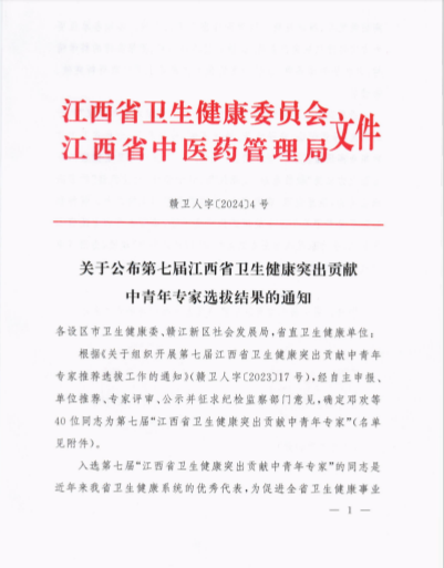 近日,由省卫健委牵头评选的第七届江西省卫生健康突出贡献中青年专家人选名单公布,来自全省卫生健康系统的40位中青年专家入选,其中我科科主任章海凤成功入选。