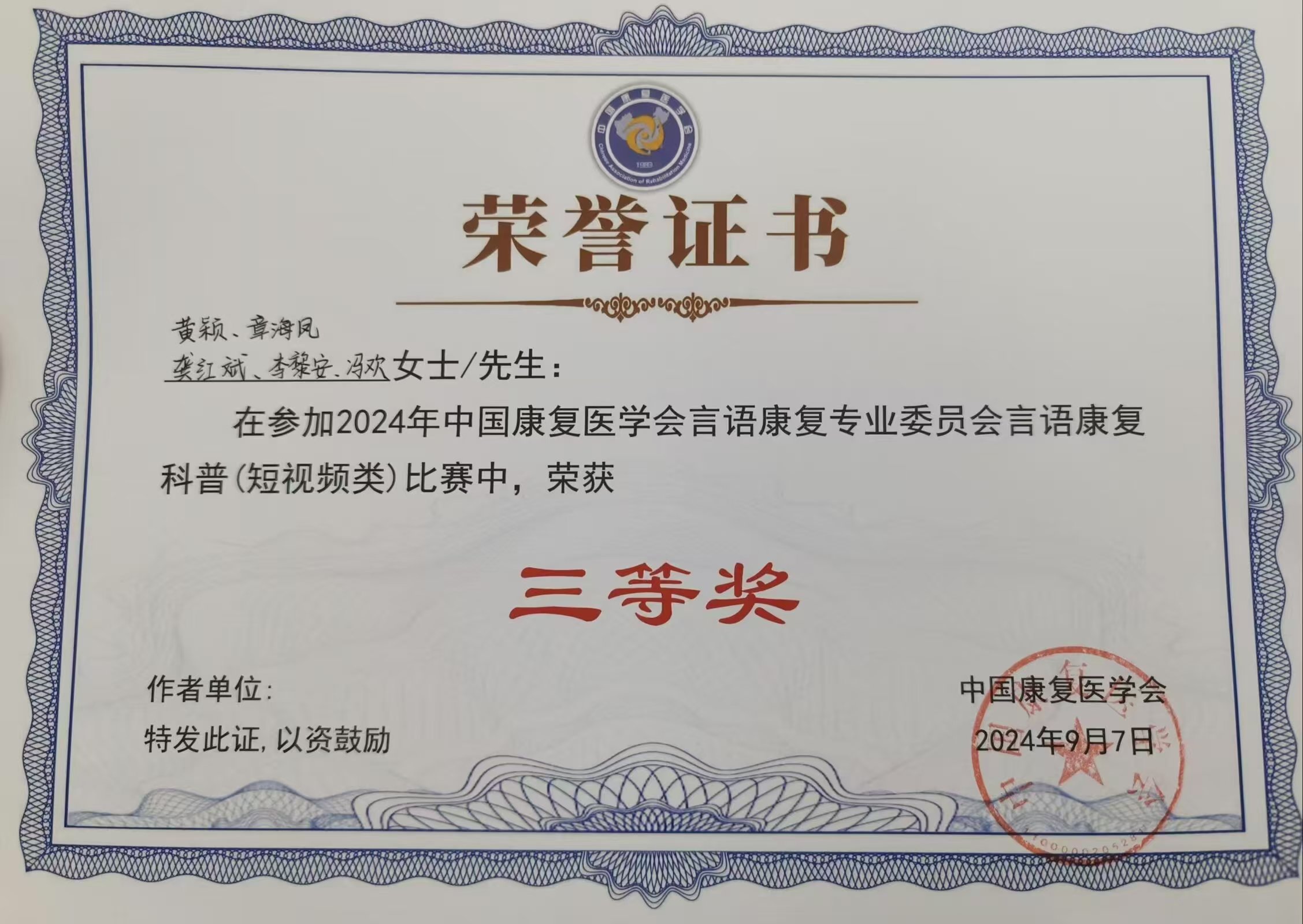 我科言语康复团队荣获2024年中国康复医学会言语康复专业委员会言语康复科普(短视频类)比赛三等奖 发布时间:2024-09-07点击次数:3652次 热烈庆祝我科言语康复团队荣获2024年中国康复医学会言语康复专业委员会言语康复科普(短视频类)比赛三等奖!