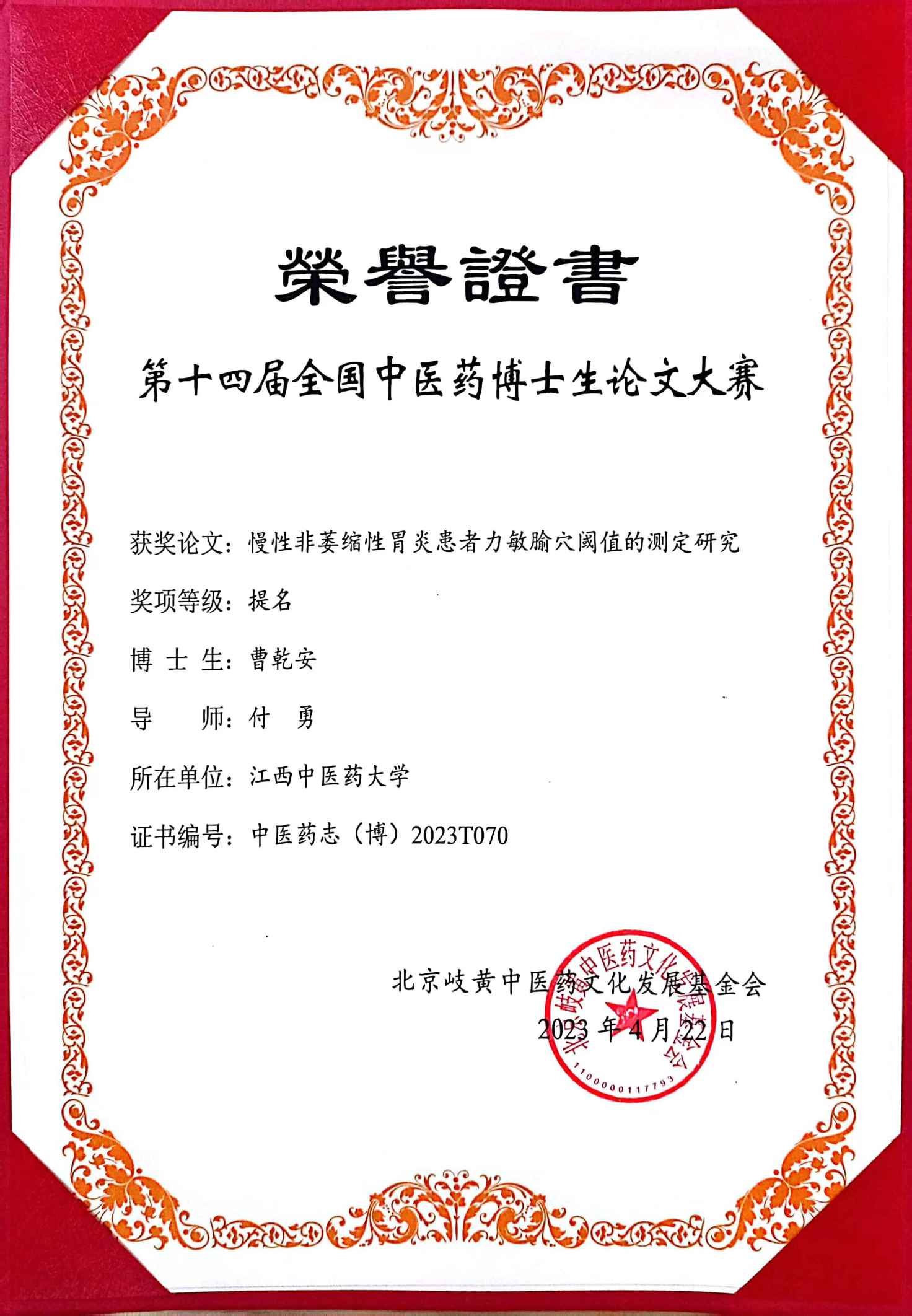 “慢性非萎缩性胃炎患者力敏腧穴阈值的测定研究”论文在第十四届全国中医药博士生论文大赛获得提名奖 发布时间:2023-09-07点击次数:21715次 热烈祝贺曹乾安同志的“慢性非萎缩性胃炎患者力敏腧穴阈值的测定研究”论文在第十四届全国中医药博士生论文大赛获得提名奖!