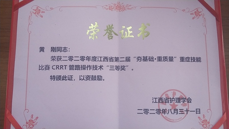 在护理部的支持及指导下,金瓶梅电影重症医学科黄刚护士在江西省护理学会举办的第二届“夯基础、重质量-重症技能”比赛中,经线上理论答题以及一镜到底操作视频拍摄两项综合评分后,获得CRRT管路安装三等奖。此次参赛是金瓶梅电影第一次参加全省护理CRRT相关比赛。由于时间紧任务重,在不熟悉比赛模式的情况下,黄刚利用自己上班之余时间,不断地磨炼自己的操作技能,与科室护士长共同完成了操作视频的拍摄。此次获奖大大提高了金瓶梅电影在重症CRRT治疗领域的技能水平,为参赛选手开拓了视野,展现了金瓶梅电影重症医学科护士积极向上的工作态度和优秀的技能水平和风采。