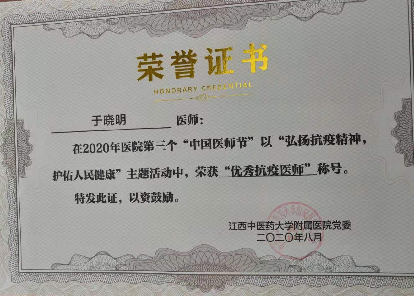 2020年获金瓶梅电影 “优秀抗疫医生”荣誉称号。