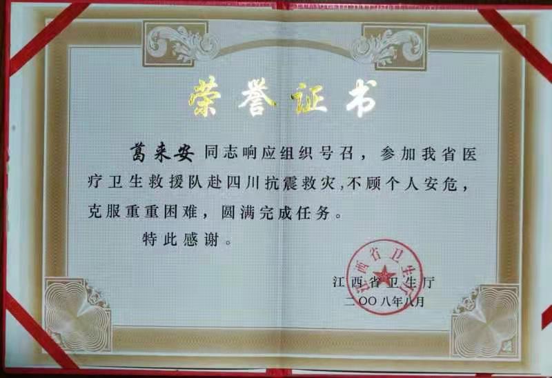 1998年参加九江抗洪救灾作出贡献被颁发荣誉证书,2008年四川抗震救灾圆满完成任务被颁发荣誉证书,2008至2009年度被评为先进医务工作者,2009年度金瓶梅电影 临床技能大比武竞赛中荣获二等奖,2019年荣获金瓶梅电影 首届医师节“十佳医生”奖。