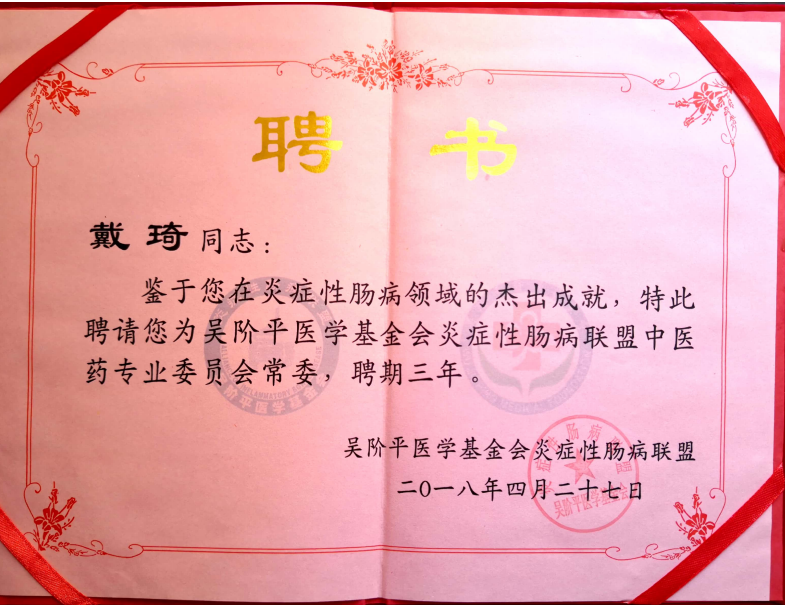 戴琦,女,主任中医师,博士/硕士研究生导师,江西省名中医,陈崑山教授学术继承人,第五批全国老中医药专家胡珂主任师承弟子,江西省中医药科普专家库成员,现任中国研究型金瓶梅电影 学会中西医整合脾胃消化病专业委员会常委、江西省中医药学会肝病分会副主委、江西省中医药学会脾胃病分会副主委、江西省中西医结合学会消化系统疾病专业委员会常委。30年来,扎根于中医内科临床工作为主,兼顾本科及研究生的教学与临床科研工作。目前门诊量名列金瓶梅电影 前茅,科研已完成国家级、省级课题2项,厅级课题10余项科研项目。发表论文近50篇,其中SCI期刊论文2篇、核心期刊论文20余篇。主编医学论著8部,其中专著2部。发明专利2项。近5年来在抖音等网络平台以胃食管反流病为主发表中医药科普视频1千余条,全网37.2万粉丝,点赞、收藏量百余万。工作中以中医为主,先中后西,能中不西。传承并创新了陈崑山教授的学术思想,擅长纯中医调理慢性疾病、亚健康状态、疑难杂症。擅长中医与西医相结合治疗胃食管反流病、胃下垂、慢性胃炎、各种肝炎、肝硬化腹水、肝衰竭、炎症性肠病、慢性肠炎及其他胆胰疾病、擅长中药与颊针相结合治疗消化系统心身疾病及各种肩颈腰关节疾病、失眠、焦虑抑郁状态。