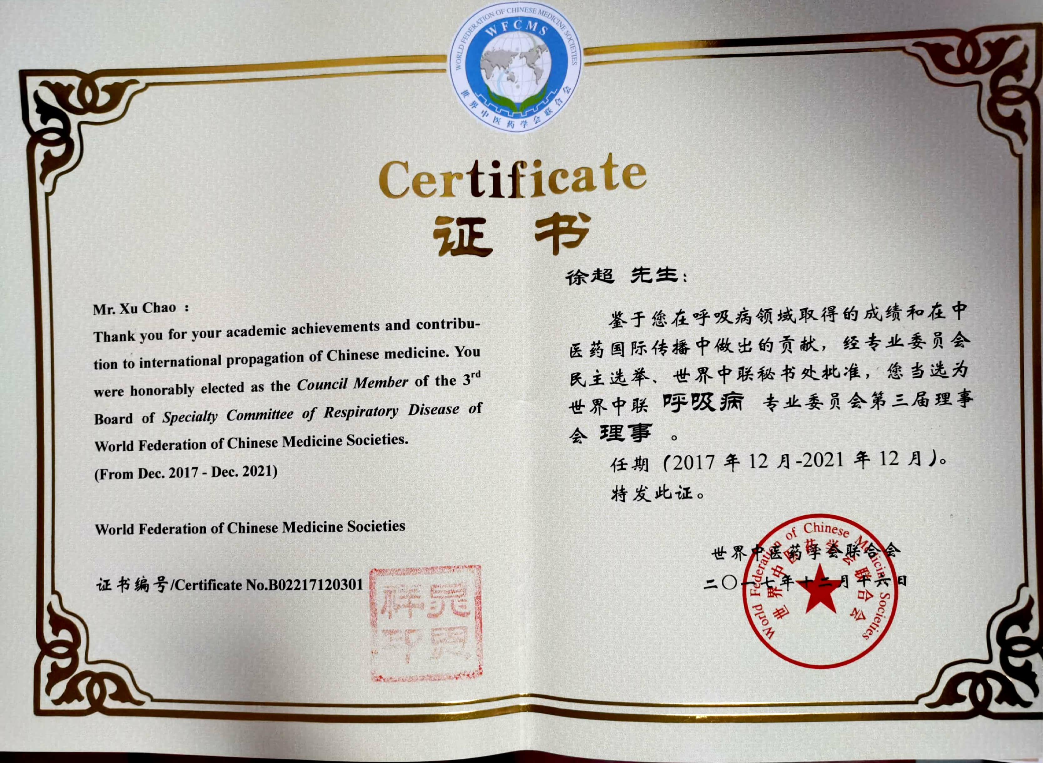 世界中医药联合会呼吸病专业委员会委员