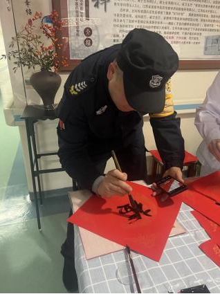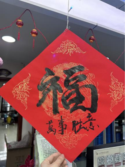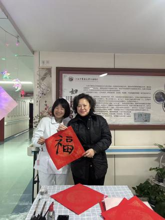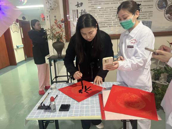 活动现场,大红宣纸与笔墨砚台整齐陈列,擅长书法的医护人员率先挥毫,笔锋流转间,一个个饱满喜庆的“福”字跃然纸上。“我也想写一幅,送给照顾我的护士们!”一位手带输液针的患者笑着上前,在医护人员的协助下,她执笔写下“福”字,又在福字下面添上“万事顺意”的小字。身旁的护士接过福字,笑着回应:“这是我收到最暖心的小年礼物!”