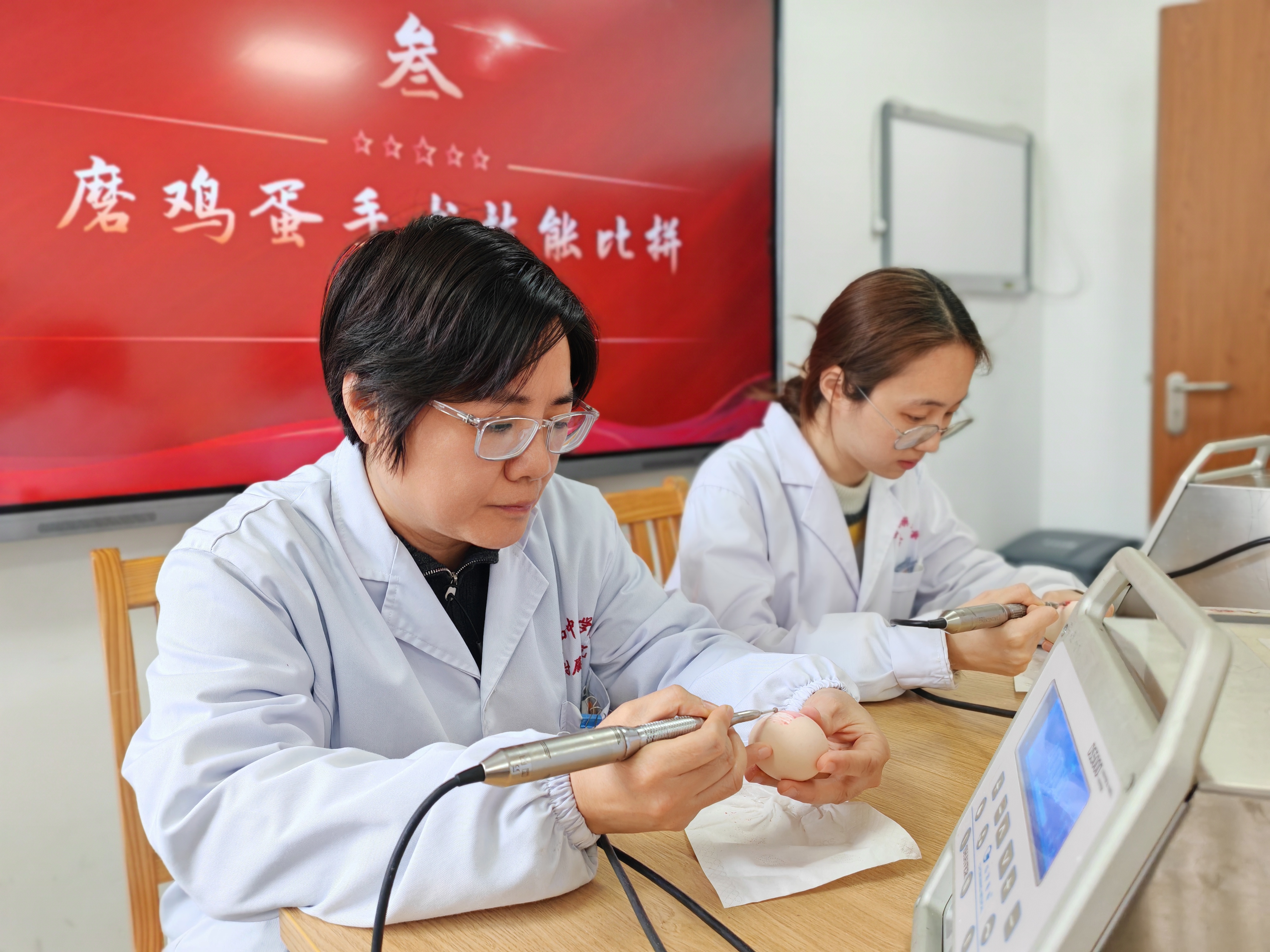 在“磨鸡蛋”手术技能比拼现场,参赛医护人员屏息凝神,端坐于显微镜前,手持精细器械,在生鸡蛋表面进行着一场无声的“微雕较量”。开窗、剥离蛋壳、暴露完整内膜——每一步都如履薄冰,极致考验手眼协调与心理素质。