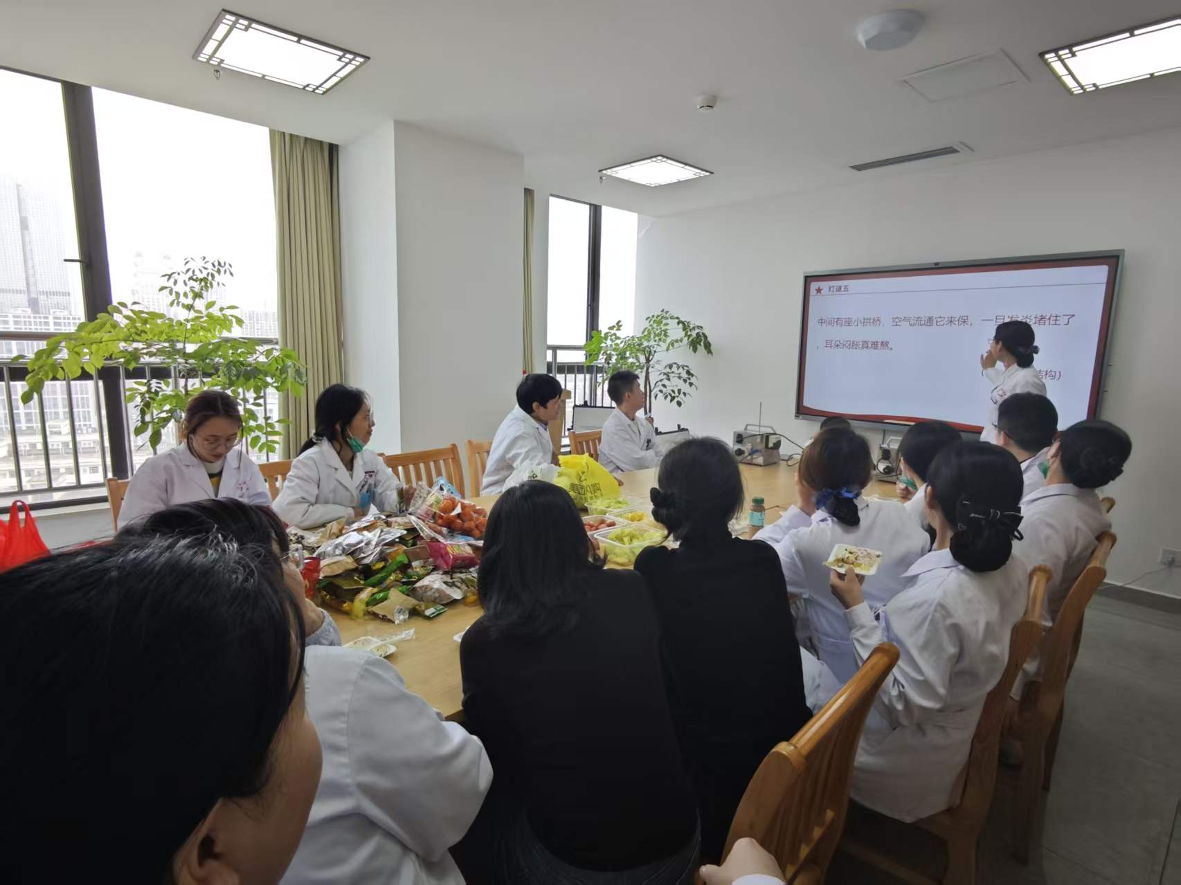 下午,科室阵地转移至1号楼13楼耳鼻咽喉科病区。褪去上午义诊的忙碌,医护人员、住院患者及家属欢聚一堂,共庆元宵佳节。
